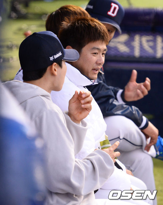 11일 오후 서울 잠실야구장에서 열린 '2015 타이어뱅크 KBO 리그' 포스트시즌 두산 베어스와 넥센 히어로즈의 준플레이오프 2차전, 8회초 우천으로 인하여 경기가 중단되자 두산 최주환이 덕아웃에서 동료들과 이야기를 나누고 있다.