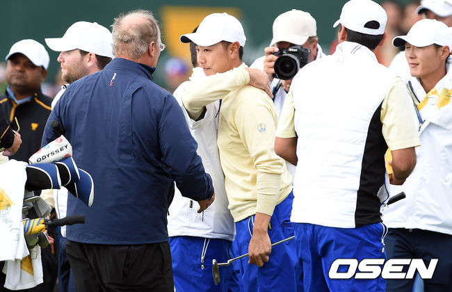 11일 오후 인천 송도 잭 니클라우스GC에서 열린 '2015 프레지던츠컵' 파이널 라운드에서 패한 배상문이 아쉬운 표정으로 팀 동료들과 포옹을 하고 있다.