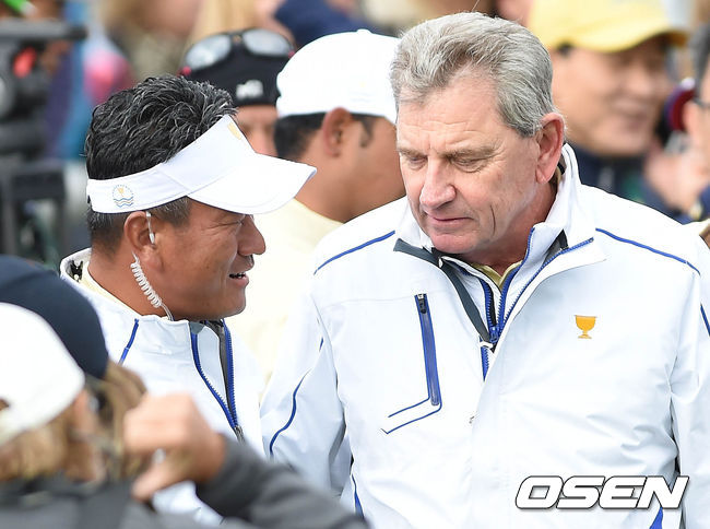 11일 오후 인천 송도 잭 니클라우스GC에서 열린 '2015 프레지던츠컵' 파이널 라운드 종료 후 인터내셔널팀 최경주 수석 부단장과 닉 프라이스 단장이 이야기를 나누고 있다.