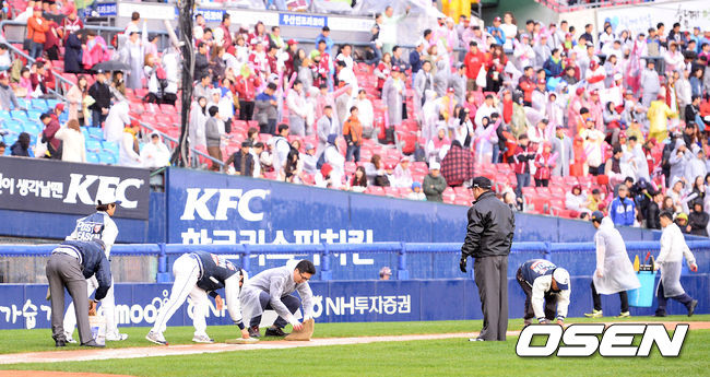 11일 오후 서울 잠실야구장에서 열린 '2015 타이어뱅크 KBO 리그' 포스트시즌 두산 베어스와 넥센 히어로즈의 준플레이오프 2차전, 비가 그친 후 구단 관계자들이 그라운드를 보수하고 있다.