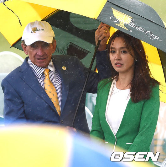 11일 오후 인천 송도 잭 니클라우스GC에서 열린 '2015 프레지던츠컵' 폐막식에서 김민아 아나운서가 팀 핀첨 PGA 커미셔너와 함께 우산을 쓰고 있다.
