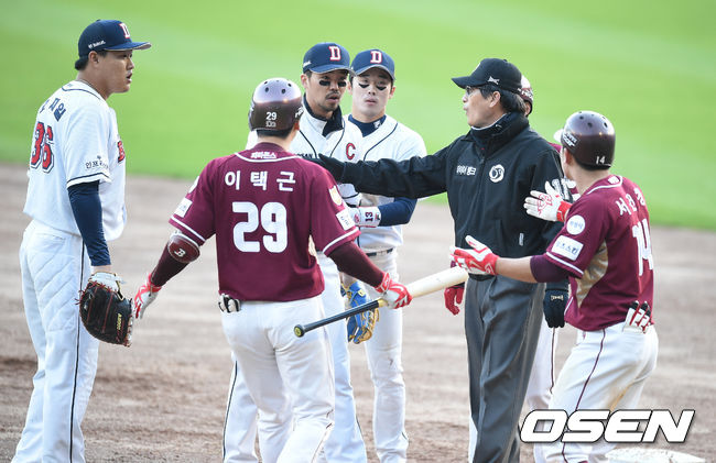 11일 오후 서울 잠실야구장에서 열린 '2015 타이어뱅크 KBO 리그' 포스트시즌 두산 베어스와 넥센 히어로즈의 준플레이오프 2차전, 8회초 무사 1,2루에서 넥센 서건창이 보내기 번트를 시도, 1루에서 두산 오재원과 아웃되는 과정에서 언쟁을 하고 있다. 이로 인해 벤치 클리어링이 일어났다.