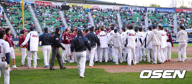 11일 오후 서울 잠실야구장에서 열린 '2015 타이어뱅크 KBO 리그' 포스트시즌 두산 베어스와 넥센 히어로즈의 준플레이오프 2차전, 8회초 무사 1,2루에서 넥센 서건창이 보내기 번트를 시도, 1루에서 두산 오재원과 아웃되는 과정에서 언쟁으로 인해 벤치 클리어링이 일어나고 있다.