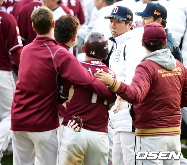 11일 오후 서울 잠실야구장에서 열린 '2015 타이어뱅크 KBO 리그' 포스트시즌 두산 베어스와 넥센 히어로즈의 준플레이오프 2차전, 8회초 무사 1,2루에서 넥센 서건창이 보내기 번트를 시도, 1루에서 두산 오재원과 아웃되는 과정에서 언쟁을 벌였다. 이로 인해 벤치 클리어링이 일어나고 있다.