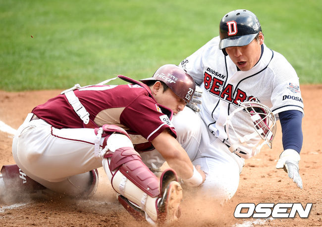 넥센은 5회말 피어밴드를 내리고 하영민을 투입, 불펜진을 가동했다. 그러자 두산은 김현수가 볼넷, 양의지가 좌전안타, 민병헌의 우전안타로 1사 만루가 됐다. 두 번째 만루찬스에서 또 오재원이 타석에 섰고, 오재원의 중견수플라이에 3루 주자 김현수가 홈으로 돌진했다. 타이밍은 아웃이었지만, 박동원이 김현수와 충돌 과정에서 공을 흘리며 세이프, 두산이 3-2로 리드했다.