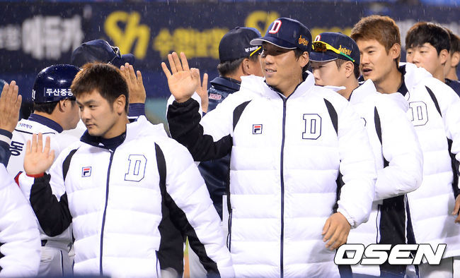 경기종료, 승리한 두산 김현수가 스텝들과 기쁨을 나누고 있다 . /ouxou@osen.co.kr