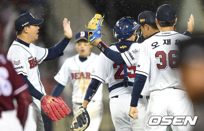 경기종료, 승리한 두산 이현승이 오재원과 기쁨의 인사를 나누고 있다. /ouxou@osen.co.kr