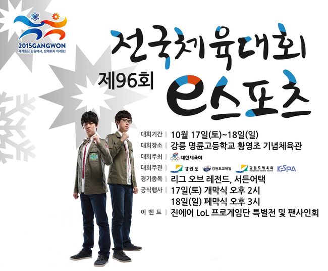 한국e스포츠협회는 오는 17일, 18일 양일간 강원도 강릉 명륜고등학교 황영조 기념체육관에서 개최되는 제96회 전국체육대회(이하 전국체전) e스포츠 현장에서 진에어 그린윙스 리그 오브 레전드(이하 LoL) 선수들의 팬 사인회 및 이벤트전과 다양한 경품을 준비했다.