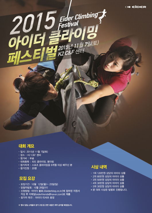 프랑스 아웃도어 브랜드 아이더(www.eider.co.kr)는 오는 11월 7일 서울 성수동 'K2 C&F(클라이밍 & 피트니스)' 센터에서 '2015 아이더 클라이밍 페스티벌(2014 Eider Climbing Festival)' 대회를 개최한다.