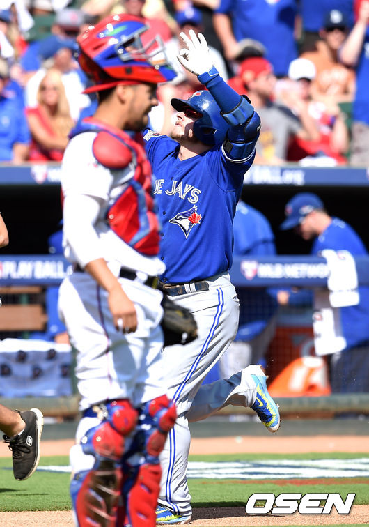 1회초 무사 1루 토론토 도널드슨이 투런 홈런을 때린 뒤 세레머니를 하고 있다.