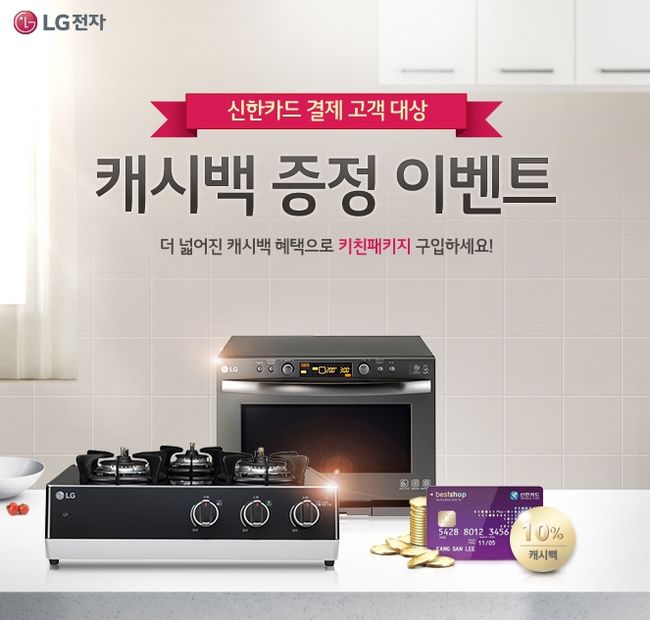 이 기간 동안 LG전자의 키친패키지 모델(광파오븐 7종, 가스레인지 4종, 히든쿡 1종, 빌트인 전기레인지 1종)을 LG 베스트샵에서 신한카드로 구매하는 소비자들은 10% 캐시백을 돌려받을 수 있다. 또한 LG전자는 광파오븐 2종(▲MA324PDW, ▲MA324DTN) 구매자에게 5만원 신세계백화점 모바일 상품권을 추가 증정할 계획이다.