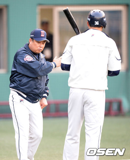 14일 오후 서울 목동구장에서 '2015 타이어뱅크 KBO 리그' 포스트시즌 넥센 히어로즈와 두산 베어스 준플레이오프 4차전이 열릴 예정인 가운데 훈련시간에 두산 김태형 감독이 오재일에게 스윙 동작을 지시하고 있다.