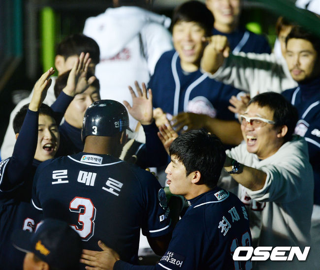 14일 오후 서울 목동구장에서 열린 '2015 타이어뱅크 KBO 리그' 포스트시즌 넥센 히어로즈와 두산 베어스 준플레이오프 4차전, 2회초 2사 주자 2루 두산 김재호의 좌중간 1타점 적시타때 홈을 밟은 로메로가 덕아웃에서 동료들과 하이파이브를 하고 있다.