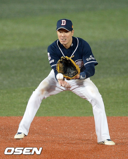 14일 오후 서울 목동구장에서 열린 '2015 타이어뱅크 KBO 리그' 포스트시즌 넥센 히어로즈와 두산 베어스 준플레이오프 4차전, 6회말 1사 주자 1루 넥센 유한준의 유격수 앞 땅볼때 김재호가 바운드 볼을 잡아내고 있다.