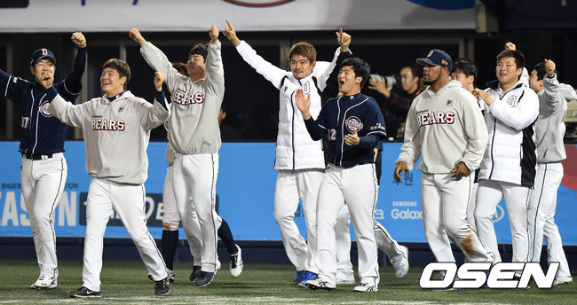 14일 오후 서울 목동구장에서 열린 '2015 타이어뱅크 KBO 리그' 준플레이오프 4차전 넥센 히어로즈와 두산 베어스의 경기 종료 후 두산 선수들이 승리를 기뻐하고 있다.
