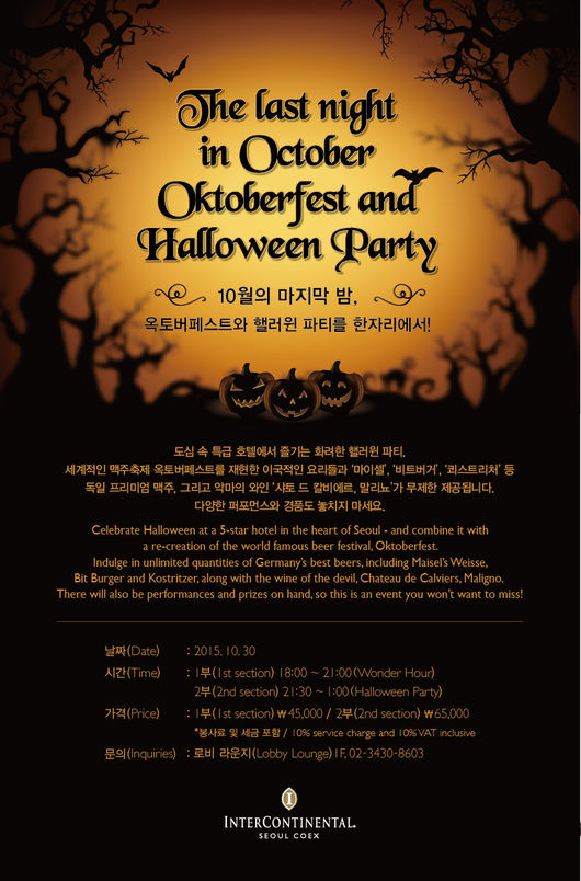 서울 삼성동 인터컨티넨탈 서울 코엑스의 로비 라운지에서는 오는 30일 단 하루 동안 할로윈 콘셉트로 꾸며진 인테리어에서 옥토버페스트 축제 스타일의 음식과 와인에 맥주까지 무제한으로 즐길 수 있는 '할로윈 인 바바리안 원더아워'를 진행한다. 이번 할로윈 인 바바리안 원더아워는 가을 독일 뮌헨에서 열리는 민속 축제이자 맥주 축제인 '옥토버페스트' 분위기에 다양한 파티 용품을 활용하여 꾸며진 파티 콘셉트의 로비 라운지에서 화려한 할로윈의 밤을 마음껏 느낄 수 있다.