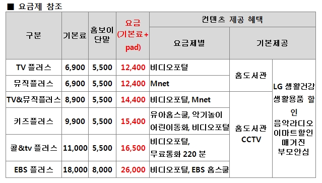 LG유플러스는 홈보이 단말기를 전화 서비스는 물론 비디오포털, Mnet, 유아/EBS홈스쿨 등의 경쟁력 있는 콘텐츠 서비스를 소비자의 소비패턴에 맞게 선택할 수 있도록 6가지의 선택형 요금제를 제공한다.