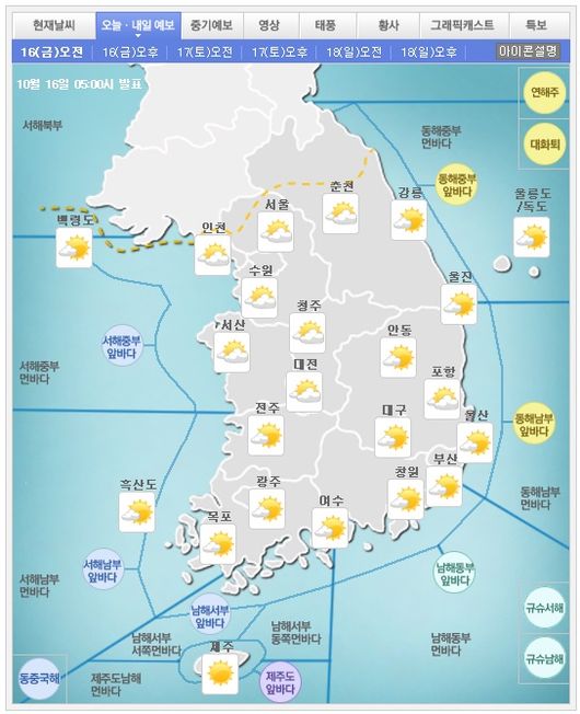 [OSEN=이슈팀] 두드러진 날씨변화는 없지만 아침 안개가 기승을 부리고 있다. 10월 16일 오전 현재, 전국이 대체로 맑은 가운데 서해안과 내륙을 중심으로 안개가 짙게 낀 곳이 많다.