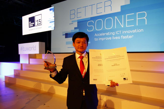 [사진] 이리언스 황정훈 본부장이 ITU Telecom World 2015에서 홍채인식 기술을 인정받아 수상한 모습. /KT 제공