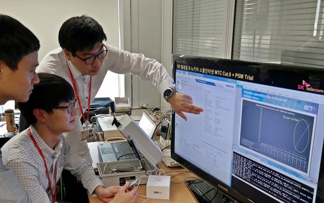 [사진] SK텔레콤과 노키아의 구성원들이 분당 소재 SK텔레콤 네트워크 기술원에서 소물인터넷 기기의 배터리 수명을 10년 이상으로 연장하는 '초절전 모드(PSM)' 기술을 테스트하고 있다. /SK텔레콤 제공