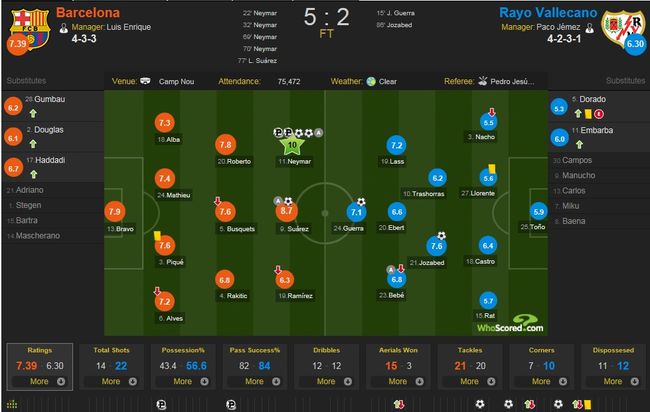 이날 승리로 바르셀로나는 승점 18점을 기록하며 라리가 2위에 올랐다. 그리고 네이마르는 4골을 뽑아내며 득점 1위(8골)에 이름을 올렸다.