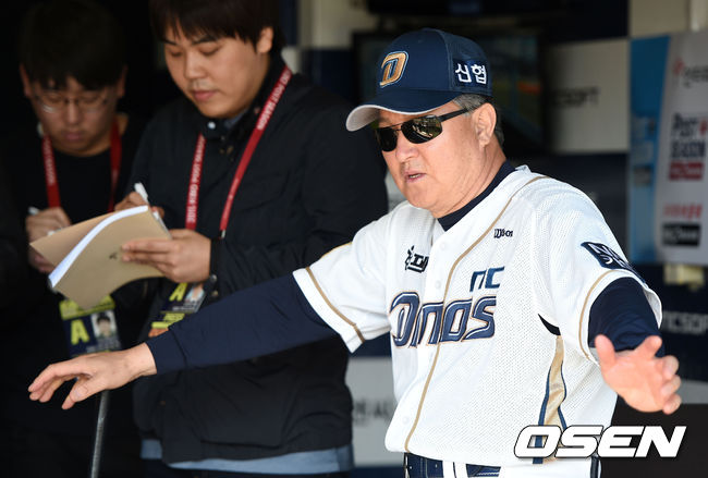 18일 경남 창원 마산야구장에서 열릴 2015 타이어뱅크 KBO리그 포스트시즌 플레이오프 1차전 NC 다이노스와 두산 베어스의 경기에 앞서 NC 김경문 감독이 취재진과 인터뷰를 하고 있다.