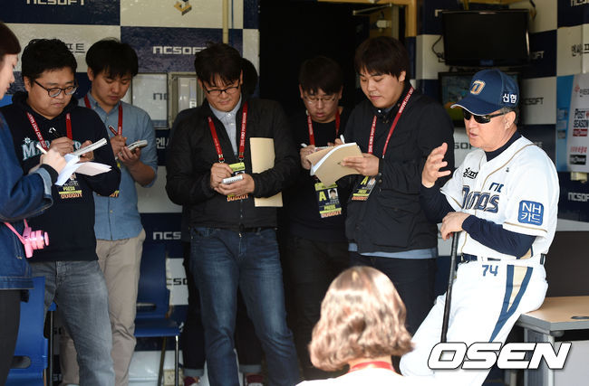 18일 경남 창원 마산야구장에서 열릴 2015 타이어뱅크 KBO리그 포스트시즌 플레이오프 1차전 NC 다이노스와 두산 베어스의 경기에 앞서 NC 김경문 감독이 취재진과 이야기를 나누고 있다.
