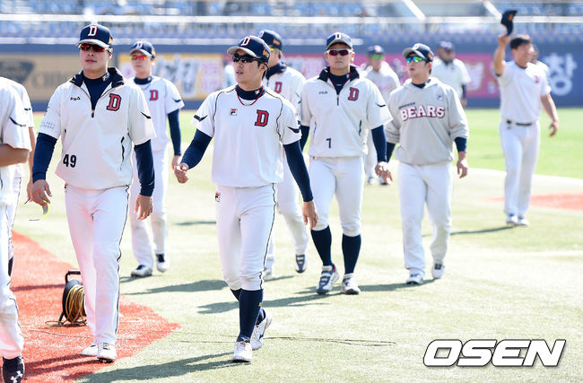 18일 경남 창원 마산야구장에서 열릴 2015 타이어뱅크 KBO리그 포스트시즌 플레이오프 1차전 NC 다이노스와 두산 베어스의 경기에 앞서 두산 선수들이 경기장으로 들어가고 있다.