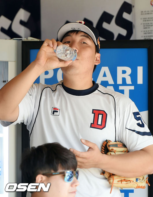18일 경남 창원 마산야구장에서 열릴 2015 타이어뱅크 KBO리그 포스트시즌 플레이오프 1차전 NC 다이노스와 두산 베어스의 경기에 앞서 두산 김현수가 물을 마시고 있다.