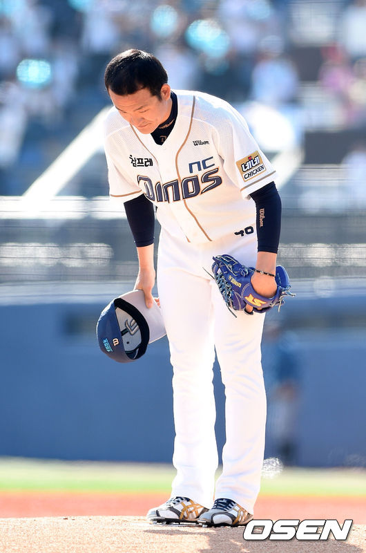 경기에 앞서 NC 원종현이 시구를 하고 있다. 원종현은 올해 2월 미국 전지훈련 중 대장암이 발견돼 수술을 받았고, 최근 완치 판정을 받았다.