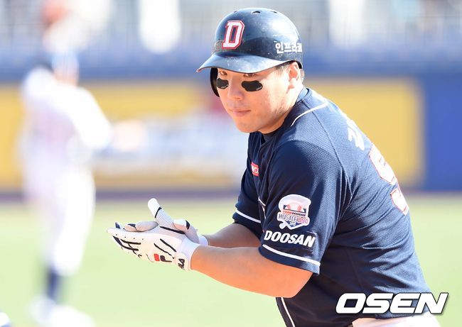 1회초 두산 공격 1사 2루 상황 김현수가 적시 1타점 안타를 날리고 1루에 안착해 박수를 치고 있다.