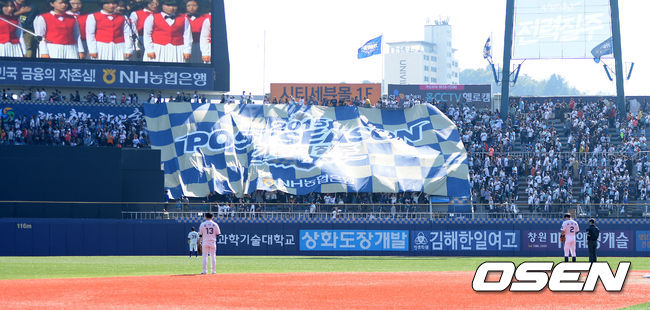 경기에 앞서 NC 팬이 응원 현수막을 펼치고 있다.