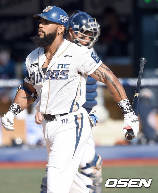 2회말 NC 공격 선두타자로 나선 테임즈가 삼진아웃을 당한 뒤 더그아웃으로 향하고 있다.