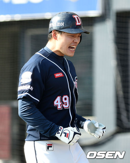 3회초 2사에서 두산 민병헌이 우월 솔로 홈런을 치고 환호하고 있다.