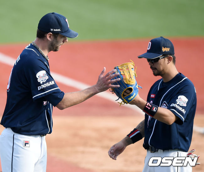 5회말을 마친 두산 니퍼트가 오재원과 하이파이브를 하고 있다.