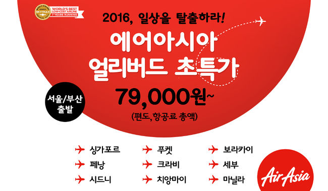 아시아 최대 저비용항공사 에어아시아는 에어아시아 그룹의 광범위한 노선을 통해 아시아 및 호주 전역으로 여행이 가능한 2016년 일상탈출 얼리버드 프로모션을 진행한다.