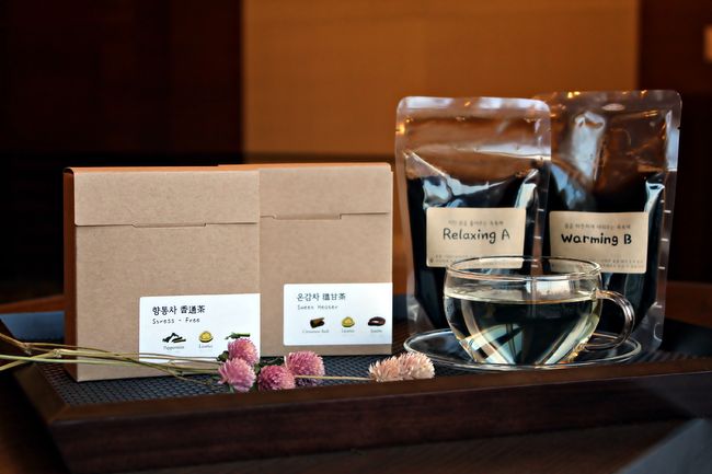 '티 테라피(www.teatherapy.com)'는 한방 차를 쉽게 즐길 수 있도록 현대인의 취향에 맞춰 연구하는 브랜드이다. 이번 컬래버레이션에서는 구기자, 오디, 대추, 감초 등 예로부터 널리 이용되었던 전통 약재를 활용한 허브 티와 족욕팩을 선보인다. '스트레스 프리(Stress-Free)' 세트는 박하, 곽향, 감초가 블렌딩 된 '향통차'와 한방 약재를 달여 만든 족욕팩 2개가 포함되어 있다. '보디 히터(Body-Heater)세트는 계피, 대추, 감초로 만든 '온감차'와 족욕팩으로 구성되었다.