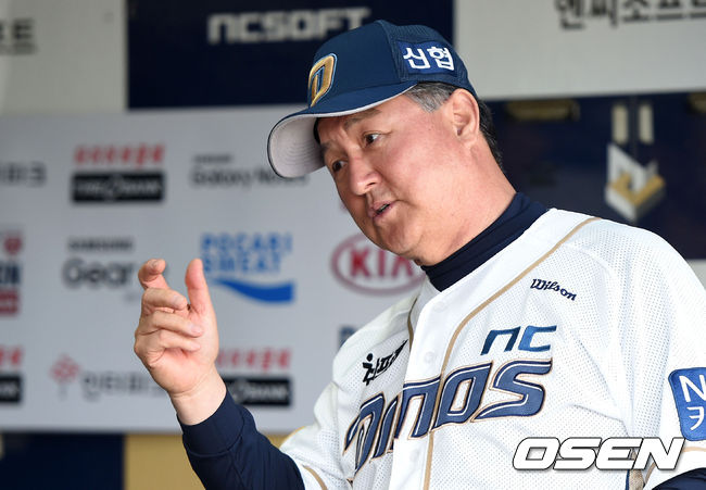 19일 오후 경남 창원 마산야구장에서 열릴 2015 타이어뱅크 KBO리그 포스트시즌 플레이오프 2차전 NC 다이노스와 두산 베어스의 경기에 앞서 NC 김경문 감독이 취재진과 이야기를 나누고 있다.
