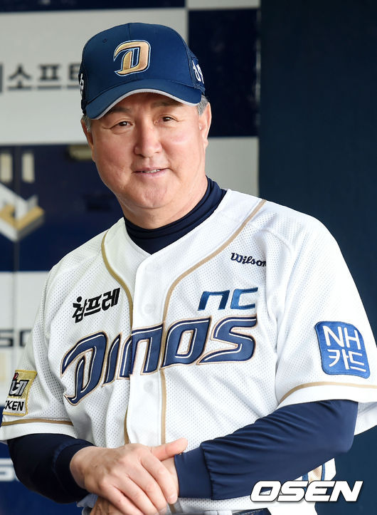 19일 오후 경남 창원 마산야구장에서 열릴 2015 타이어뱅크 KBO리그 포스트시즌 플레이오프 2차전 NC 다이노스와 두산 베어스의 경기에 앞서 덕아웃에서 NC 김경문 감독이 미소짓고 있다.