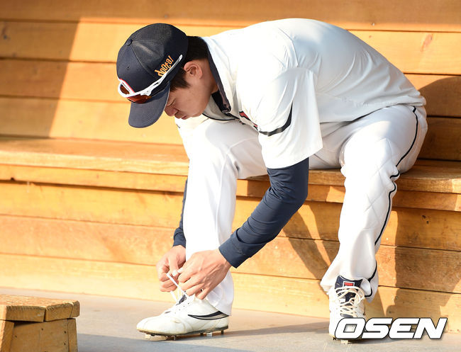 19일 오후 경남 창원 마산야구장에서 열릴 2015 타이어뱅크 KBO리그 포스트시즌 플레이오프 2차전 NC 다이노스와 두산 베어스의 경기에 앞서 두산 민병헌이 신발끈을 묶고 있다.