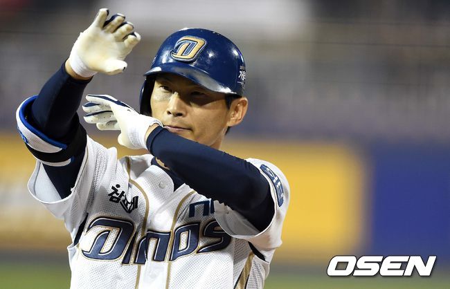 1회말 NC 공격 선두타자로 나선 김종호가 중전안타를 날리고 1루에 안착해 기뻐하고 있다.