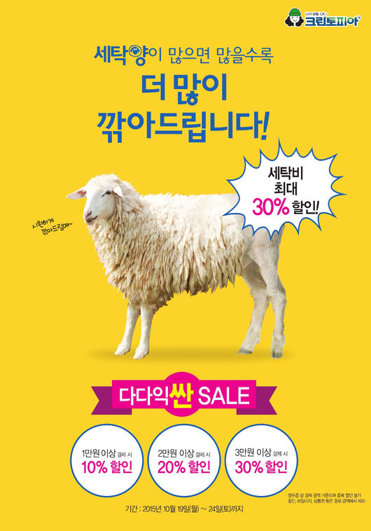 19일부터 24일까지 6일 동안 진행되는 '다다익싼 세일'은 크린토피아의 세탁 서비스를 최대 30%까지 할인 받을 수 있는 환절기 빅 세일 이벤트다.