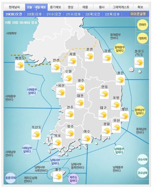 10월 20일 오전 현재, 전국이 대체로 맑으나, 서해안과 내륙을 중심으로 안개가 낀 곳이 있다. 또한 경기 충청 호남권에 미세먼지가 ‘나쁨’ 수준이다. 미세먼지 ‘나쁨’ 상태가 발령 됐을 때는 장시간 또는 무리한 실외활동을 제한하는 것이 좋다.