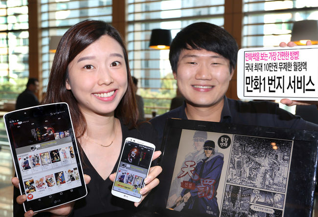 LG유플러스(부회장 이상철 / www.uplus.co.kr)가 미디어로그와 제휴를 통해 국내 최저 가격인 월정액 7,000원(부가세 없음)으로 국내 최다인 10만권의 만화를 볼 수 있는 프리미엄 정액형 서비스인 ‘만화1번지’를 20일 출시했다고 밝혔다.