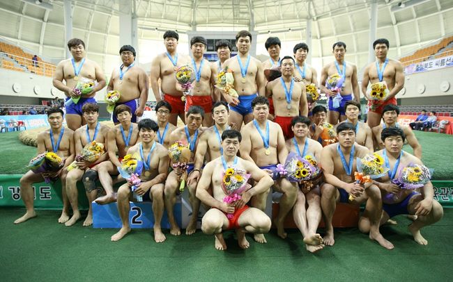 특히, 가장 치열했던 장사급(150kg이하) 결승에서는 지난해 보은대회와 단오대회에서 백두장사에 오른 김진(충청북도/증평군청)이 이재혁(울산광역시/울산동구청)을 물리치고 팀에 1998년 이후 약 17년 만에 전국체육대회 금메달을 선사했다. / 10bird@osen.co.kr