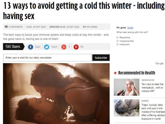특히 ‘미러’는 ‘엘라 알레드라는 영양학자에 따르면 주기적인 성관계는 면역글로불린 A의 분비량을 증가시킨다. 면역글로불린은 추위와 감기로부터 몸을 보호해준다. 성관계 후 충분한 숙면을 취하면 스트레스도 감소한다’라고 보도했다.