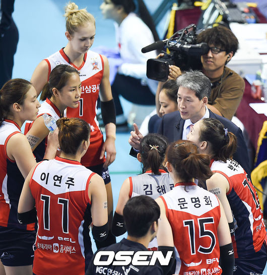 20일 오후 대전 충무체육관서 진행된 '2015-2016 NH농협 V-리그' 여자부 KGC인삼공사와 IBK기업은행의 경기, 1세트 인삼공사 이성희 감독이 선수들에게 작전 지시를 하고 있다.