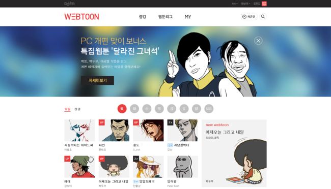 다음웹툰은 우선 심플하고, 직관적인 형태로 메뉴 및 페이지를 새로 구성했다. 기존 홈페이지의 다양한 메뉴와 카테고리를 생략, 홈은 이용자가 가장 많이 찾는 ‘요일별 연재작’ 중심으로, 그리고 메뉴는 ‘랭킹’ ‘웹툰리그’ ‘My’ 만 보여주는 형태로 수정했다. 이용자가 당일 업데이트된 작품부터 빠르게 확인하고, 다양한 인기 웹툰 목록을 한 눈에 확인할 수 있도록 한 것이다.