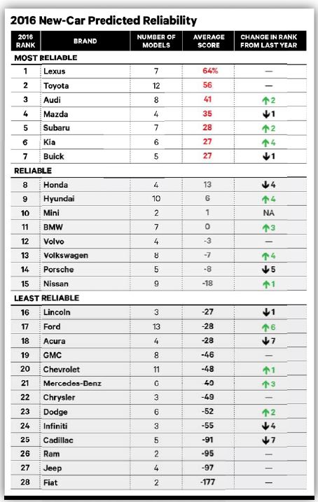 컨슈머리포트는 매년 미국내 판매되는 차량들의 신뢰성을 평가해 순위를 발표하고 있으며, 가장 권위있는 소비자 잡지로써 차량 구입에 막대한 영향을 끼치고 있다.