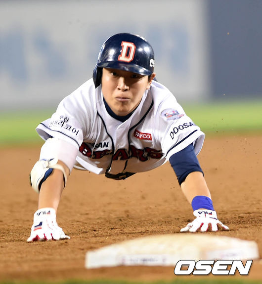 21일 오후 서울 잠실구장에서 열리는 '2015 타이어뱅크 KBO 리그' 플레이오프 3차전 두산 베어스와 NC 다이노스의 경기,2회말 2사 1루 정수빈이 동점 3루타를 치고 3루 베이스를 향해 슬라이딩하고 있다.